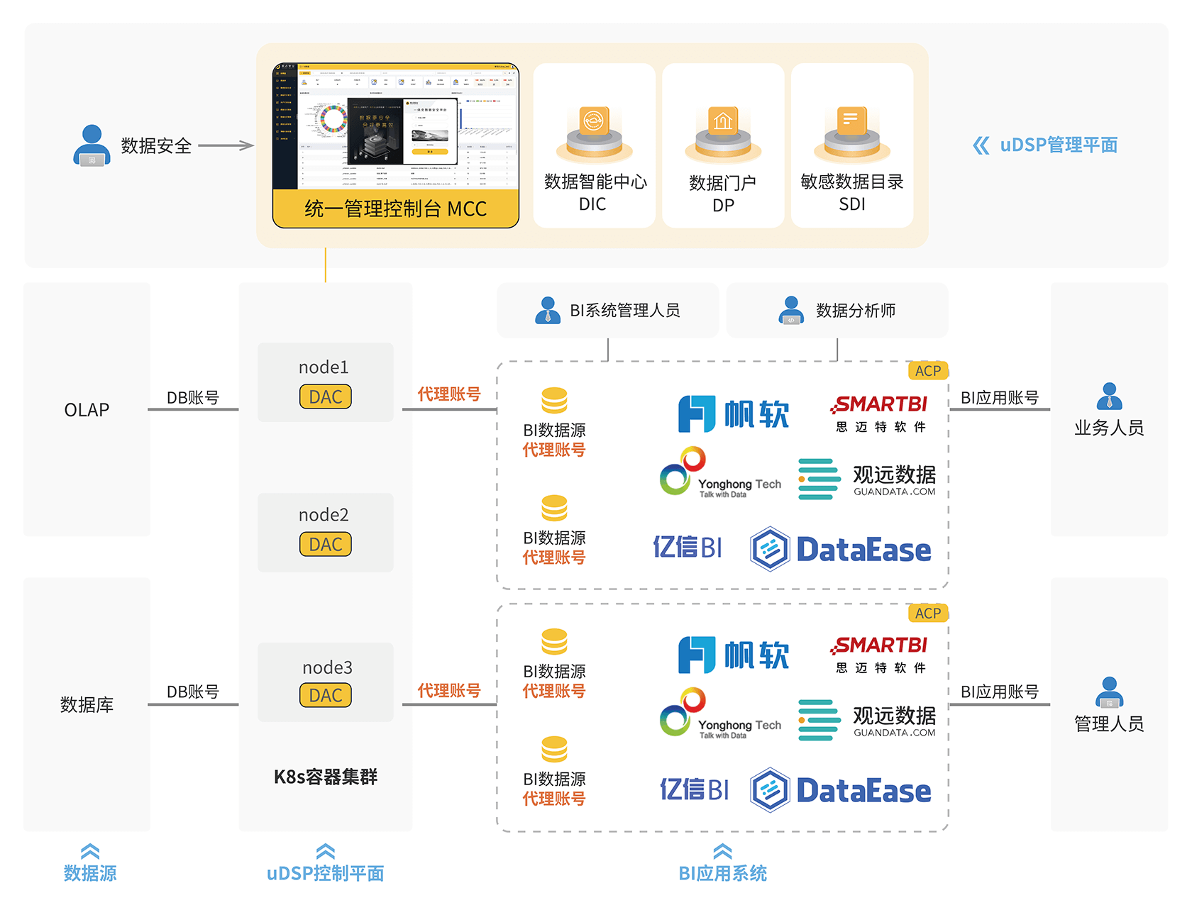 AG旗舰厅(中国)一体化数据安全平台 uDSP 针对 BI 数据分析场景的业务和技术特点,采取“贴源保护”的技术思路,部署在 BI 应用系统和数据源中间,解耦数据安全与数据业务,给予一体化协同的敏感数据保护能力。